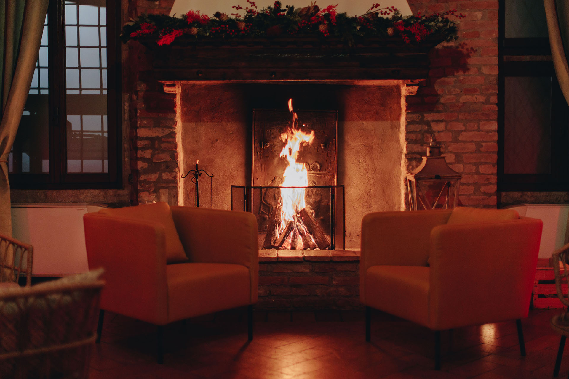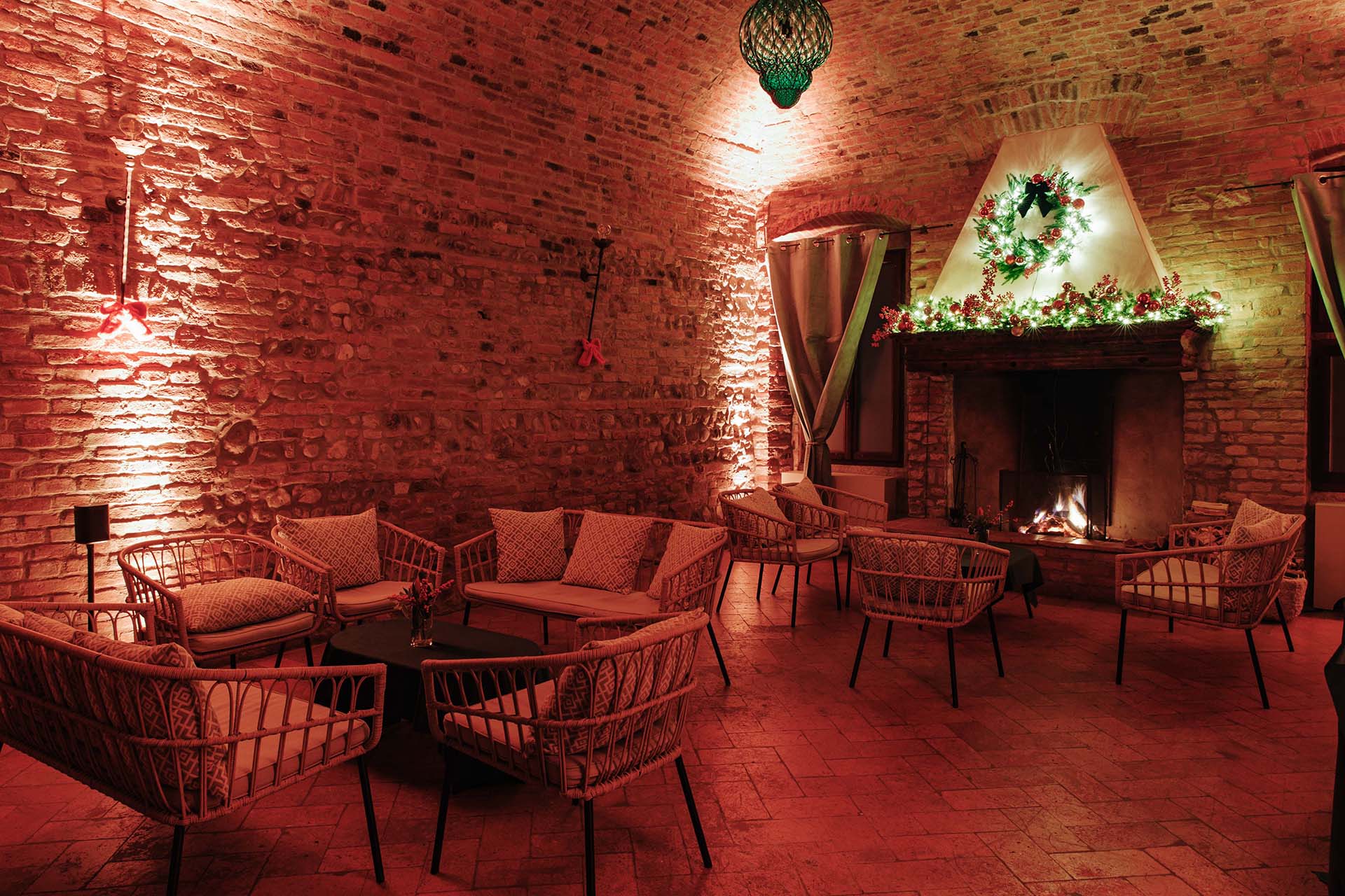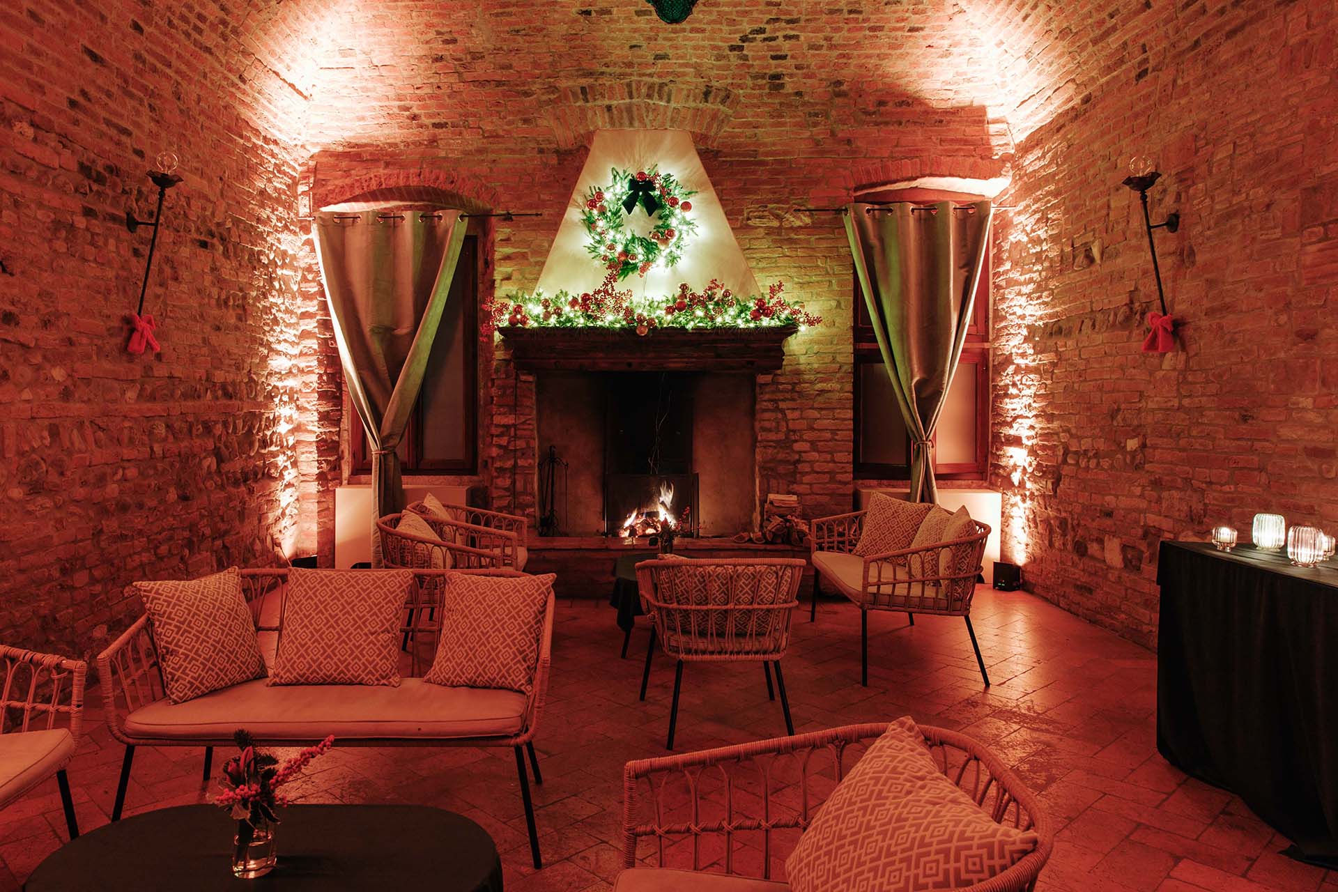 Stile caldo e accogliente con camino originale, perfetta per piccoli eventi privati e business, possibilità di setup personalizzato.